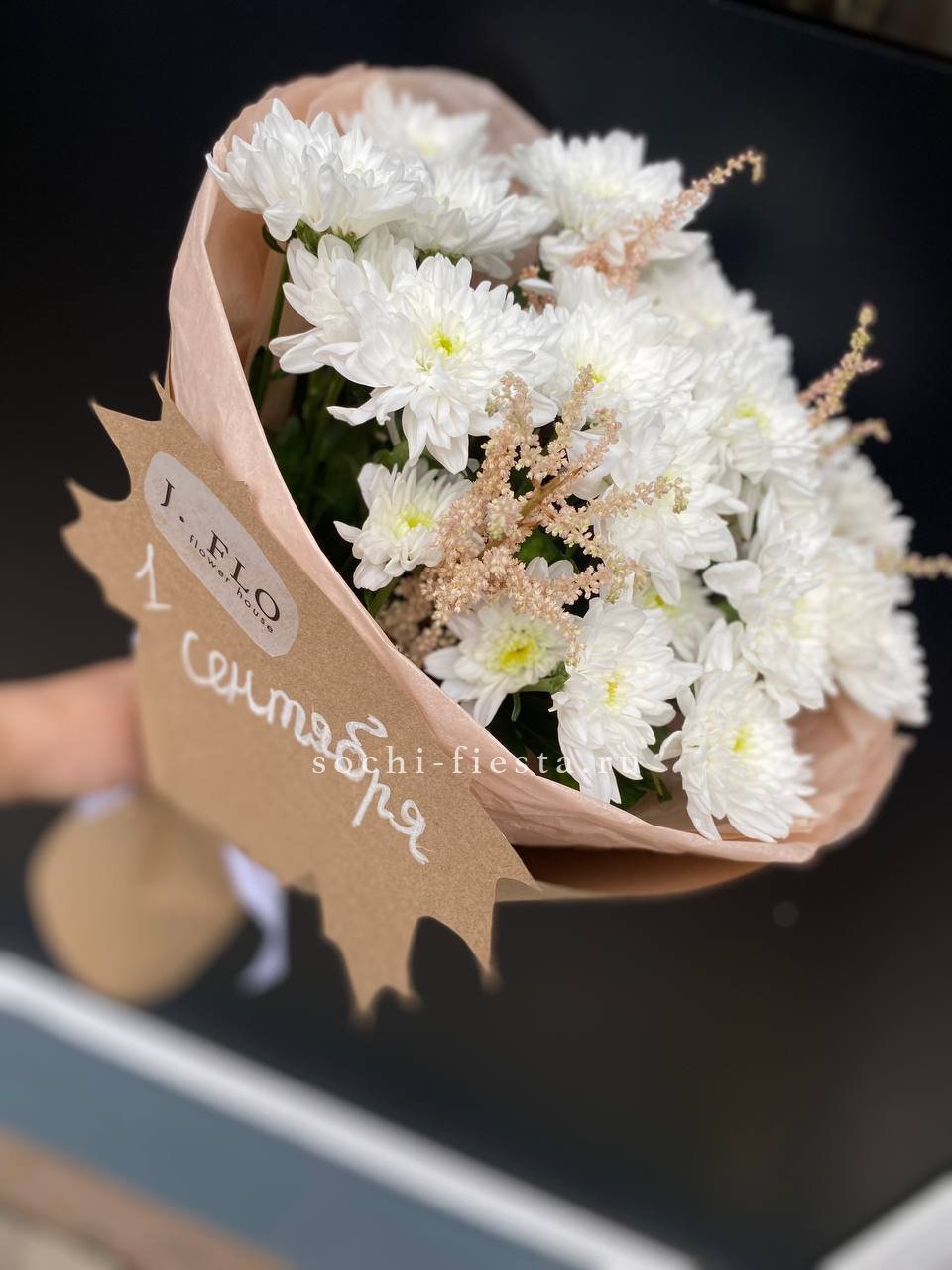 Белоснежные шапки хризантем и воздушные метелки астильбы собраны в композицию с четким вертикальным ритмом. Букет напоминает о первых школьных линейках и свежести сентябрьского утра.