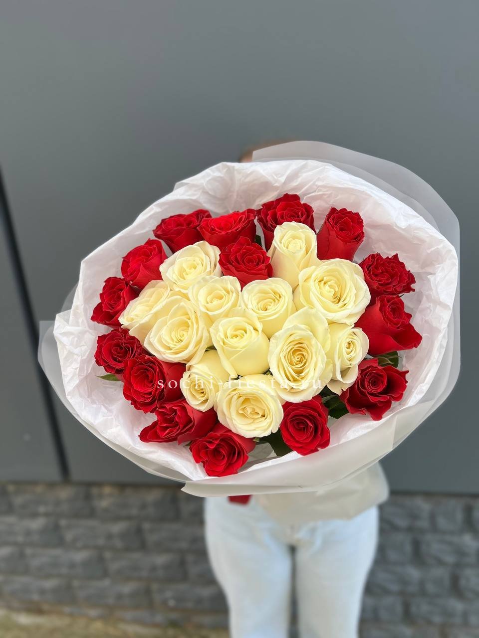Пятьдесят один бутон выложен в форме сердца — геометрия чувств в живом исполнении. Авторская работа с силуэтом превращает классические розы в объёмную романтичную композицию.