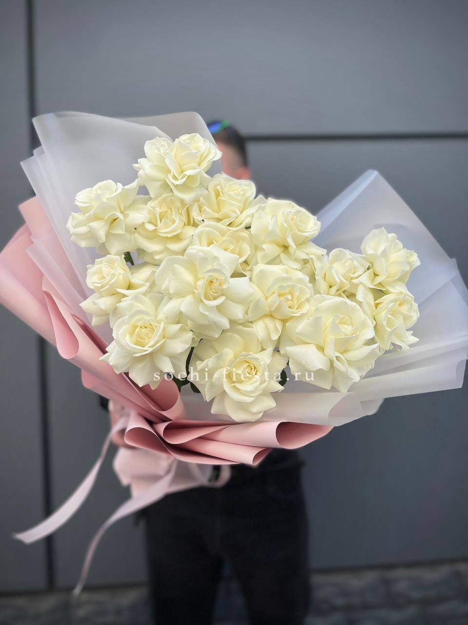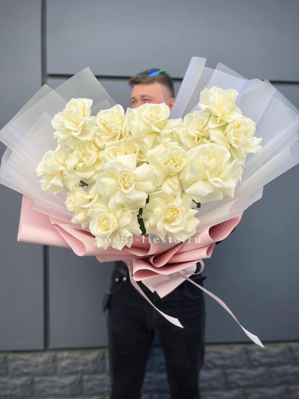 Девятнадцать белых роз в лаконичной крафтовой упаковке держат чёткий силуэт. Прямые стебли и плотные бутоны создают графичную композицию.