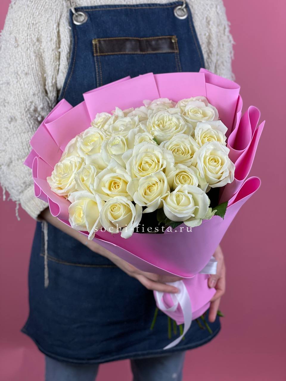 25 белых роз, лента, упаковка на выбор.