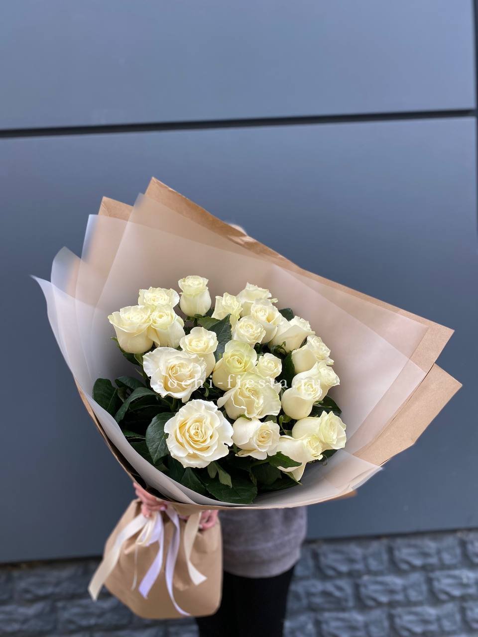 25 белых роз, сухоцветы, дизайнерская упаковка.