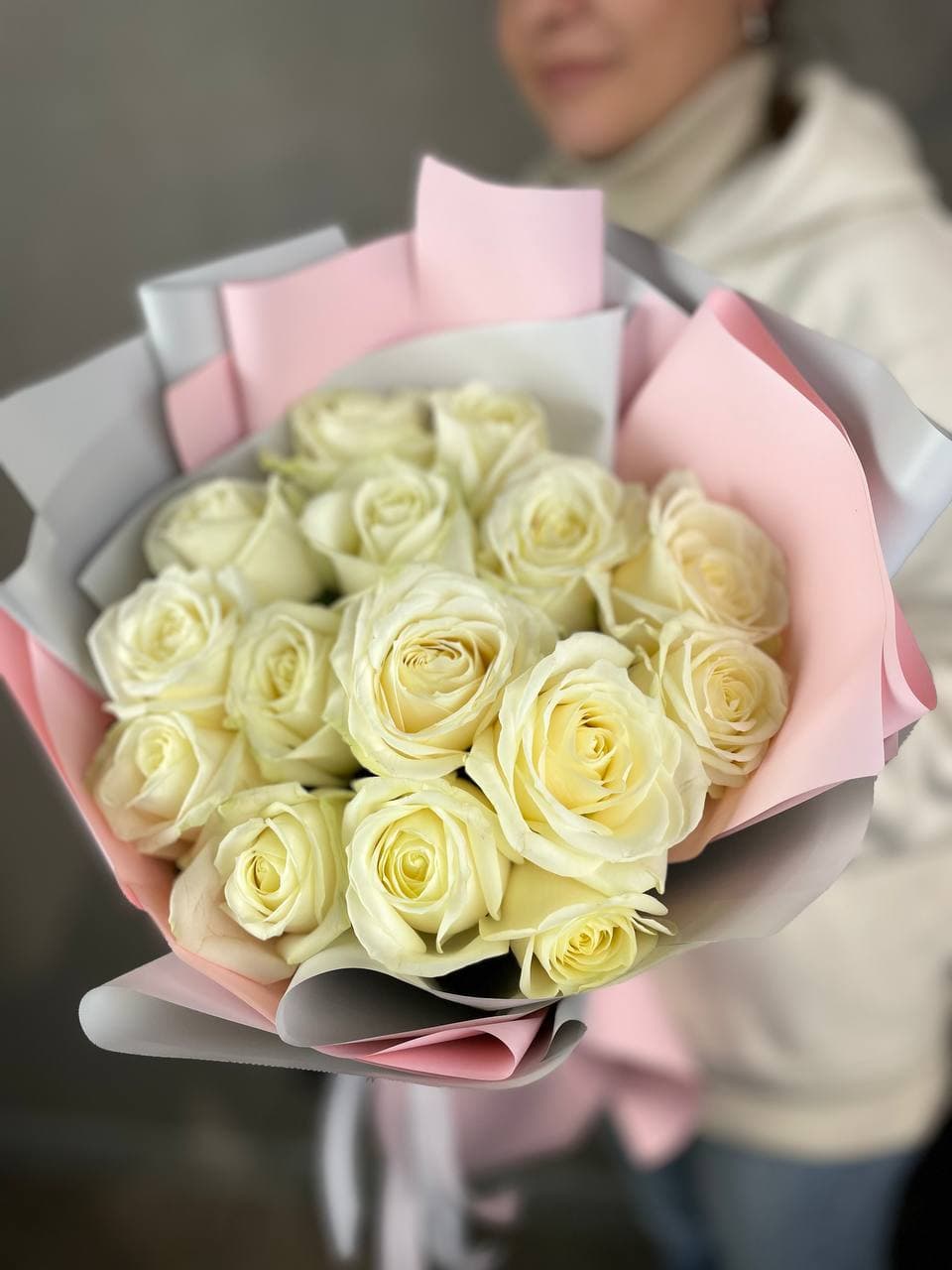 Розы сорта Siena раскрываются медленно, сохраняя плотность лепестков несколько дней. Пятнадцать бутонов образуют объёмную композицию с выразительной фактурой. Белый цвет остаётся безупречным.
