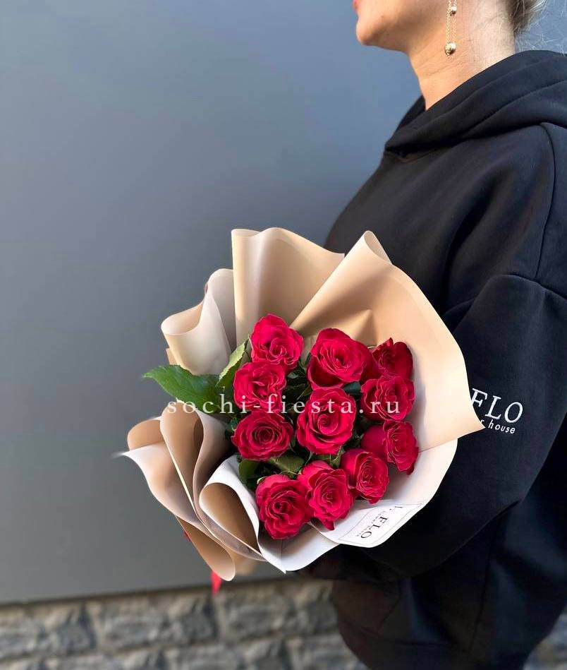 Вывернутые лепестки французских роз раскрываются широко и создают объёмную текстуру. Пампасная трава добавляет воздушности и смягчает линии. Пятнадцать бутонов в авторской упаковке выглядят свежо и современно.