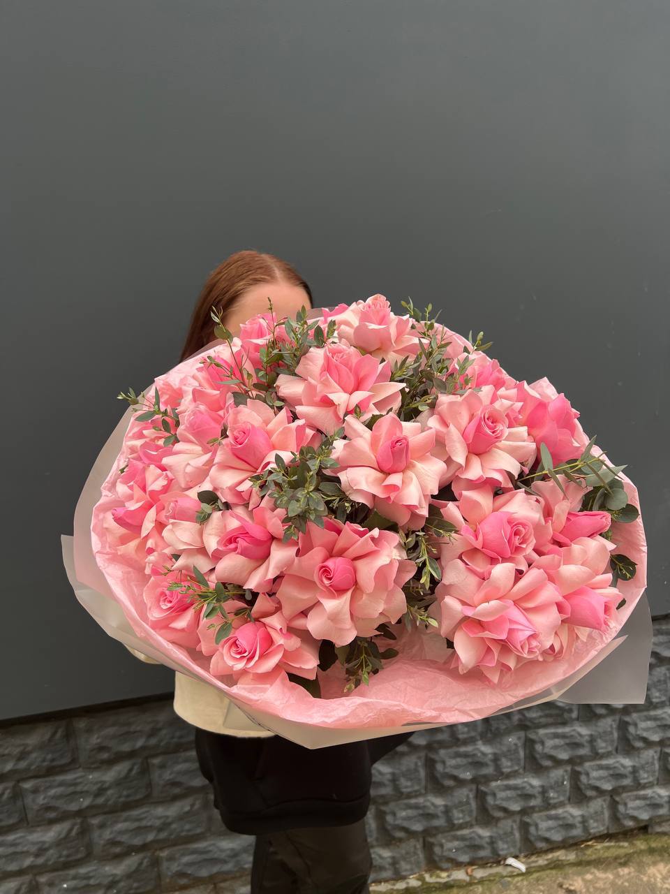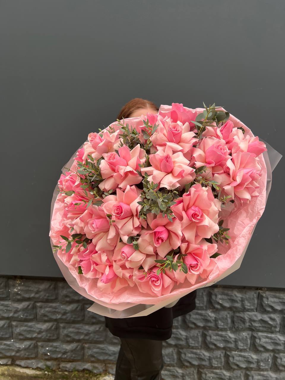 Пятьдесят один бутон с двухцветным переходом от белого края к розовой середине. Пионовидная форма создаёт пышную текстуру и глубину. Лента фиксирует композицию без лишних деталей.