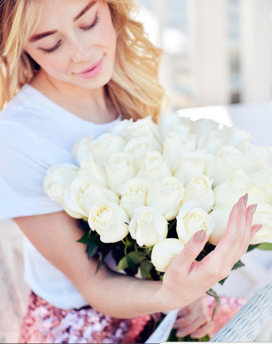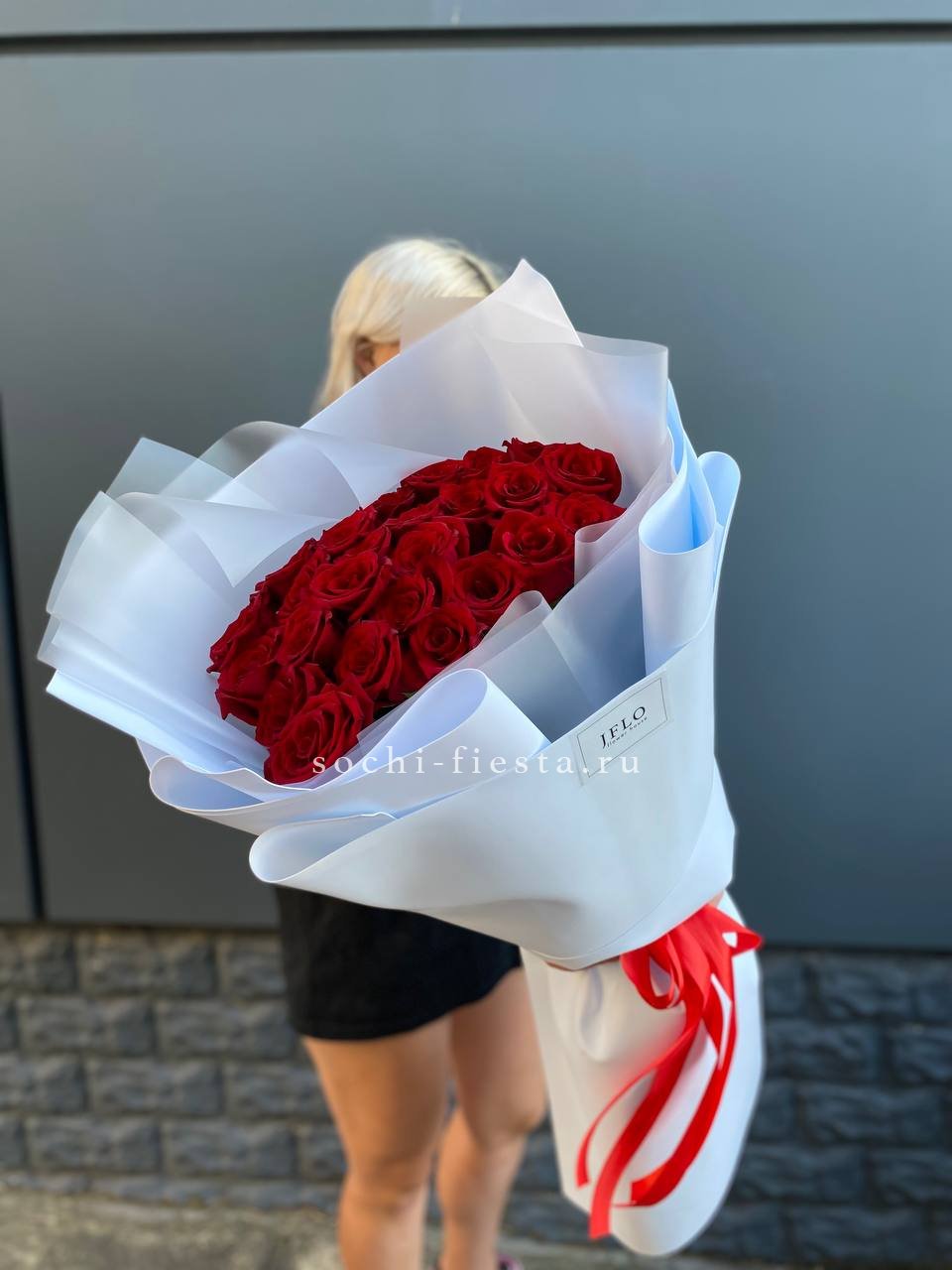 Тридцать один белоснежный бутон собран в высокий монохромный букет с чистым силуэтом. Голландские розы образуют плотную воздушную форму и впечатляют присутствием в любом пространстве.