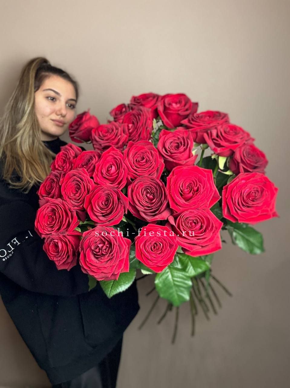 Двадцать пять красных роз собраны в плотный монохромный букет. Глубокий алый оттенок создаёт насыщенное цветовое пятно, которое притягивает внимание и наполняет пространство энергией.