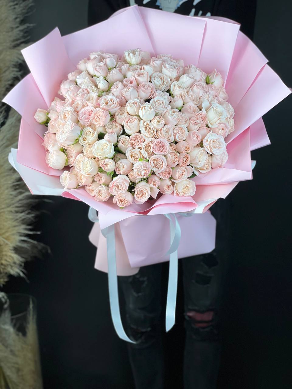 Пятьдесят одна кустовая роза собрана в плотный купол с множеством мелких бутонов на каждой ветке. Пышная композиция с ветками эвкалипта создает объемную форму и наполняет пространство свежестью. Яркий жест для тех, кто ценит масштаб и щедрость