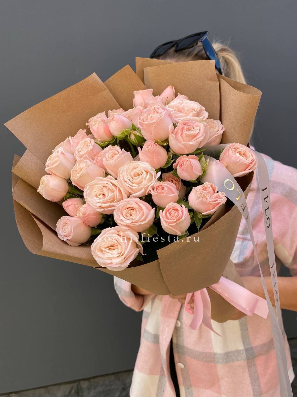 кустовая роза - 19 шт., эвкалипт, лента, дизайнерская упаковка.
