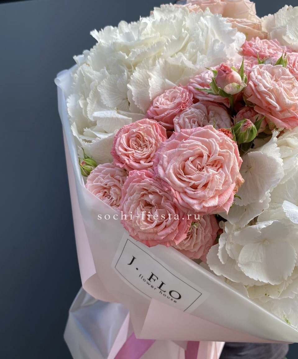 гортензия, кустовая роза, лента, упаковка.