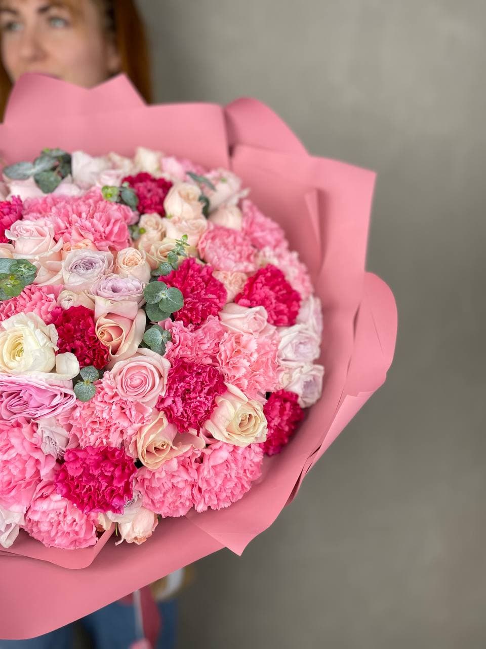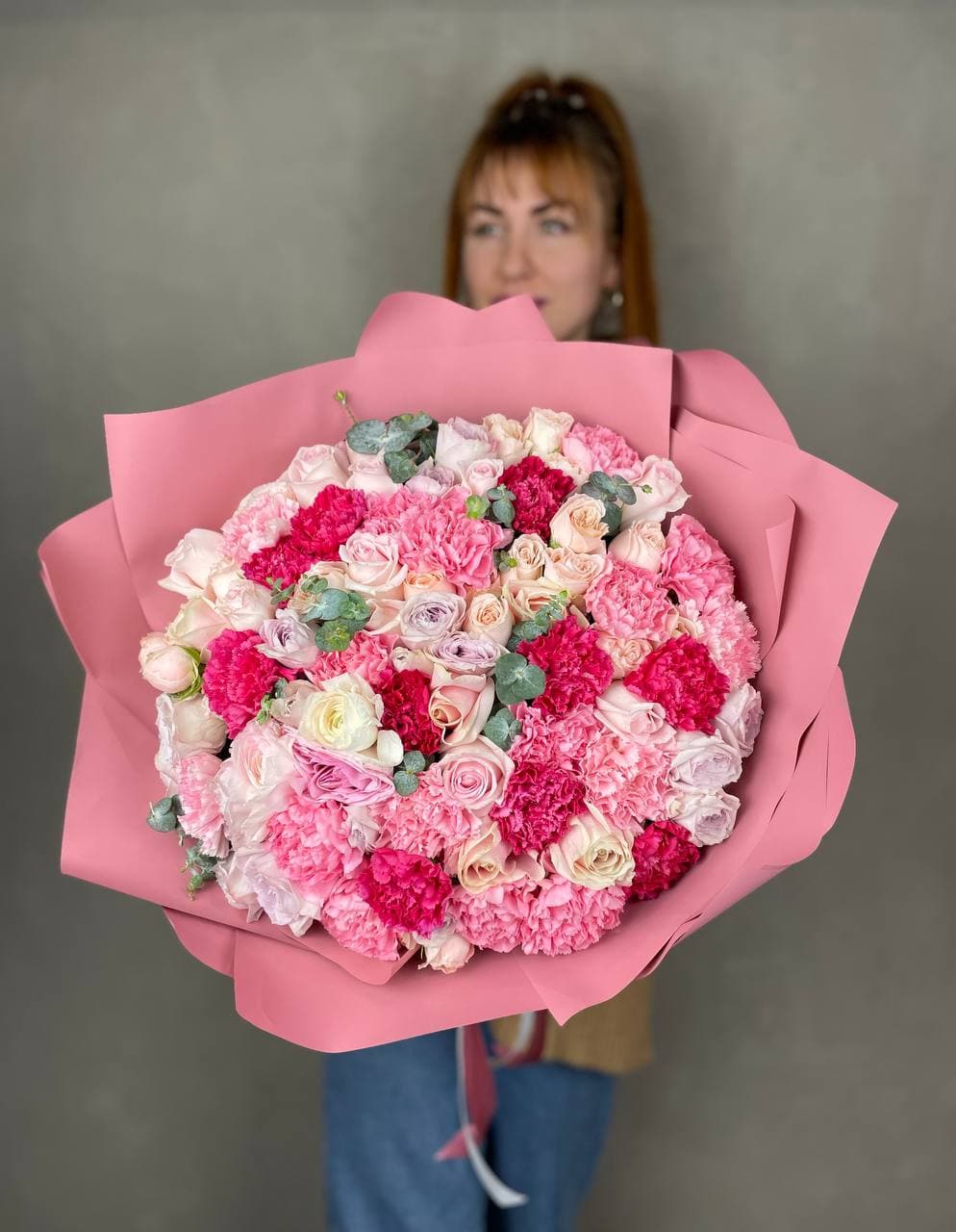 Воздушная композиция в кремовых и белых тонах собрана из нескольких видов цветов с разной формой бутонов. Эустома и диантусы создают мягкую текстуру, а кустовые розы добавляют объём и завершённость силуэту.