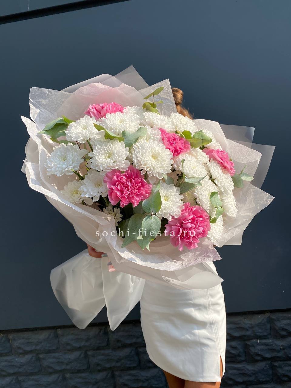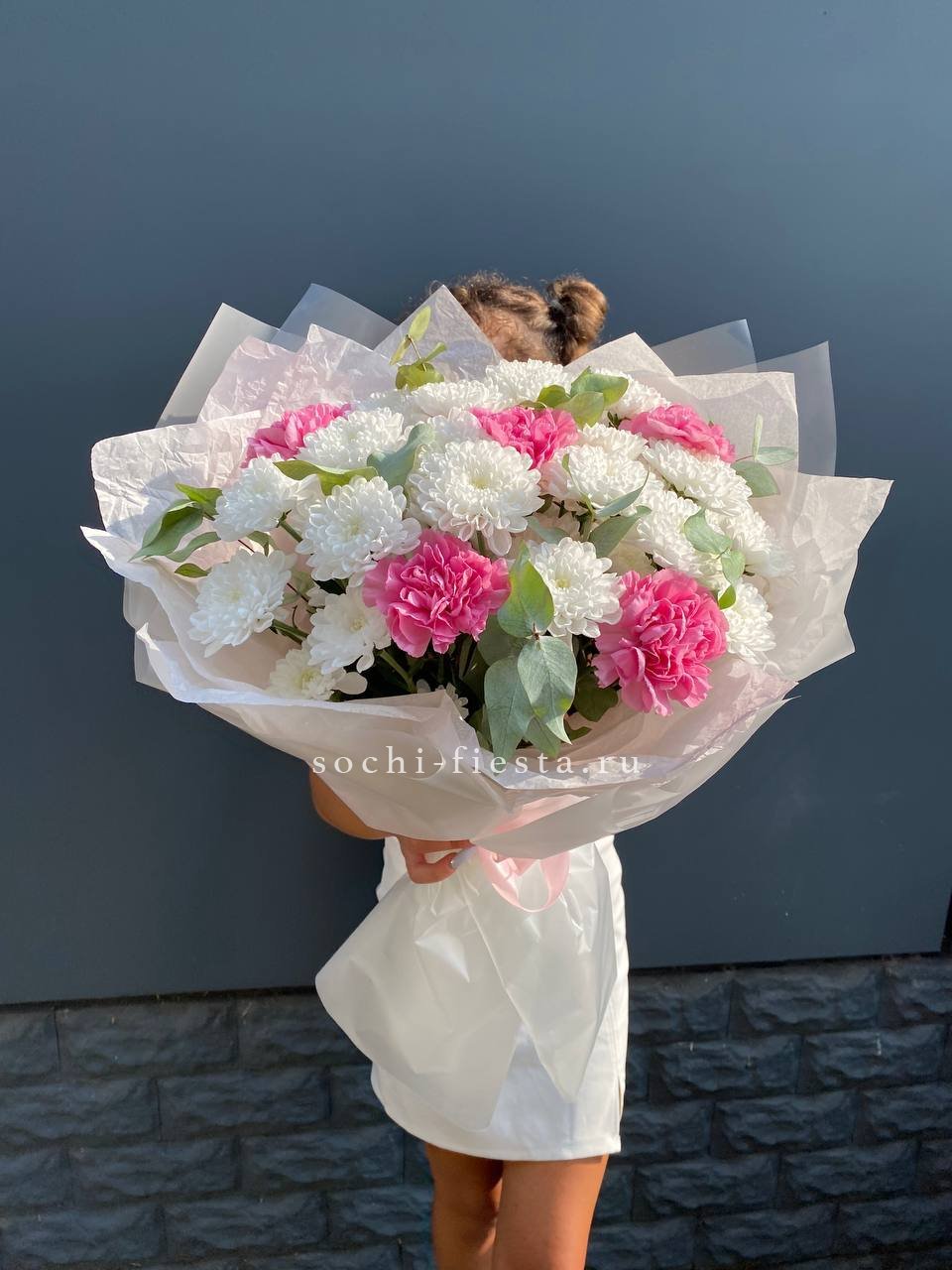 эустома, диантусы, кремовая кустовая роза или белые розы, авторское оформление.