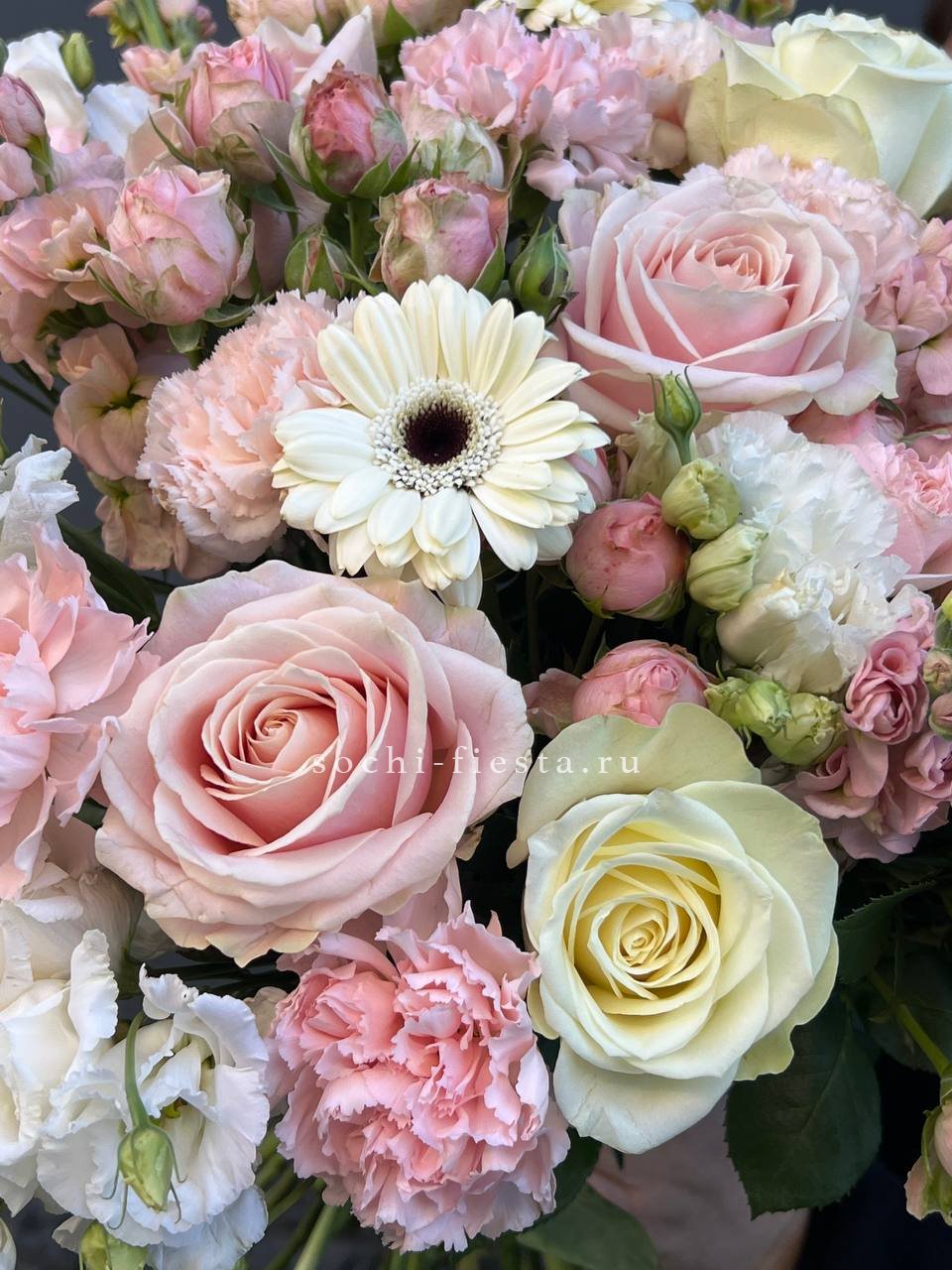 эустома, диантус, гербера, маттиола, бомбастик, розы лента. Состав может меняться в зависимости от сезона.