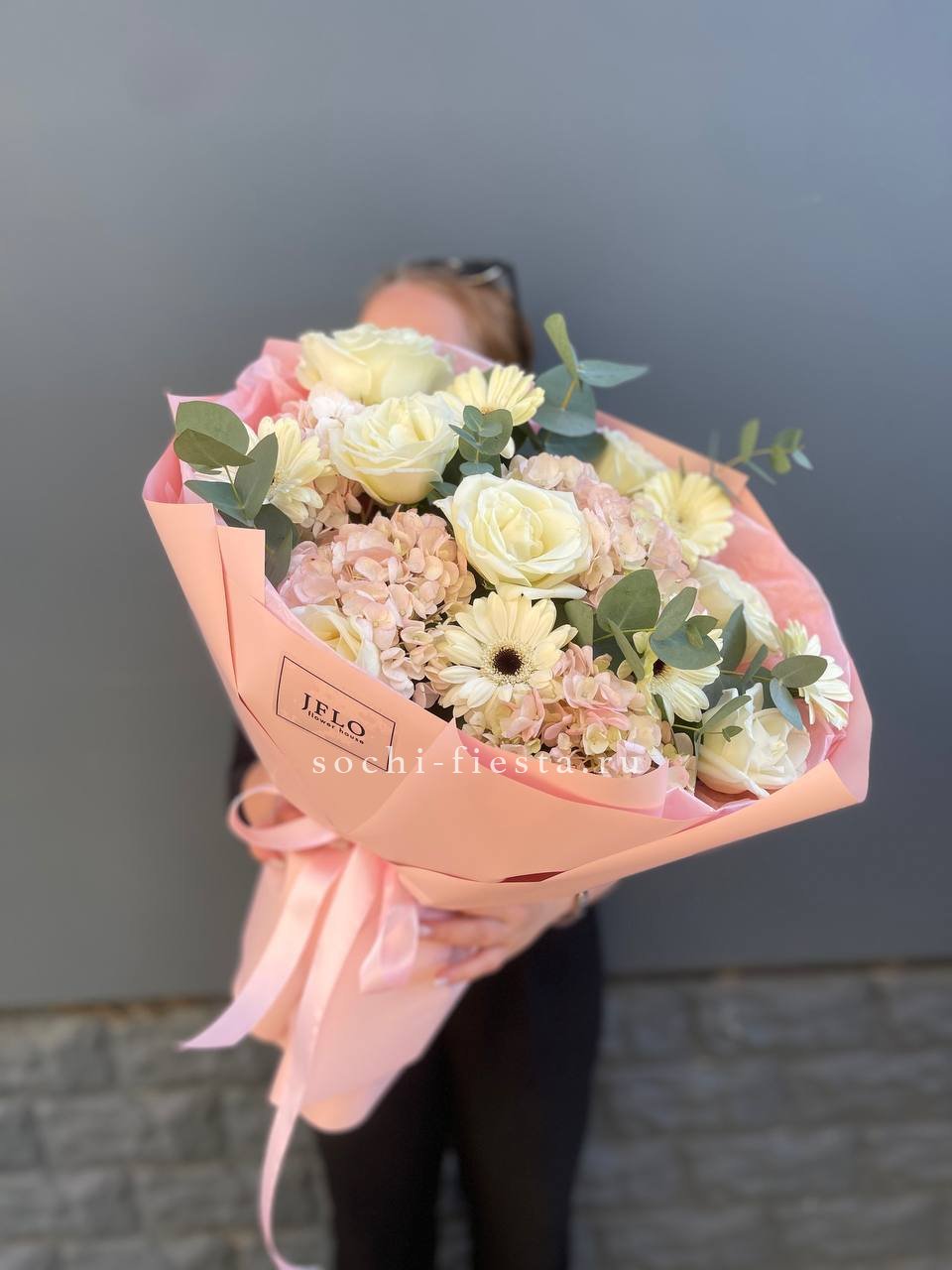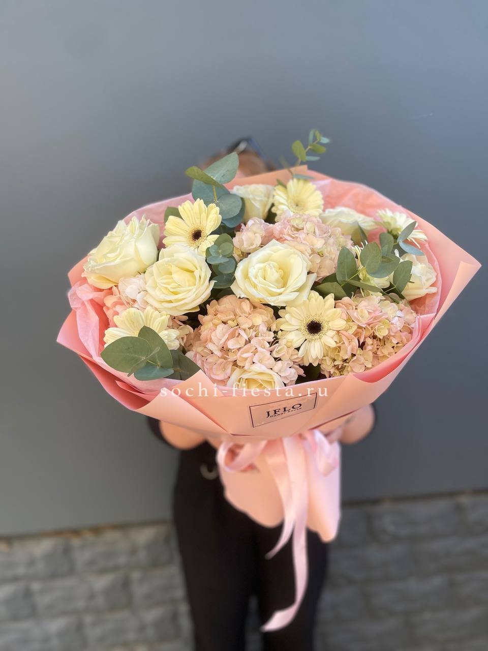 Герберы задают открытый характер букета, розы добавляют мягкости, а гортензия наполняет объёмом. Композиция смотрится свежо и держит форму без усилий.