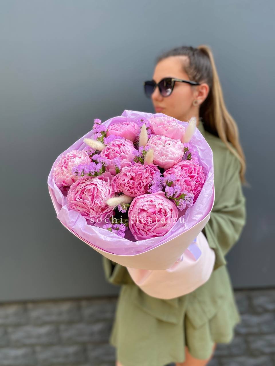 Крупные бутоны пионов окружены воздушными метёлками лагуруса и мелкими соцветиями статицы. Композиция собрана с акцентом на естественную лёгкость и свободное движение линий.