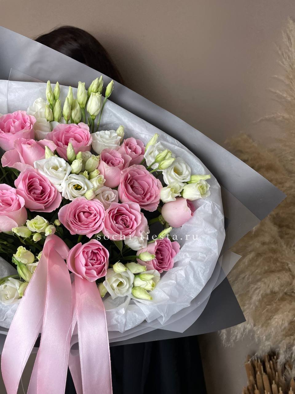 Розовые розы и эустома создают мягкую цветовую волну без резких переходов. Композиция собрана компактно и подходит для пространств с любой стилистикой.