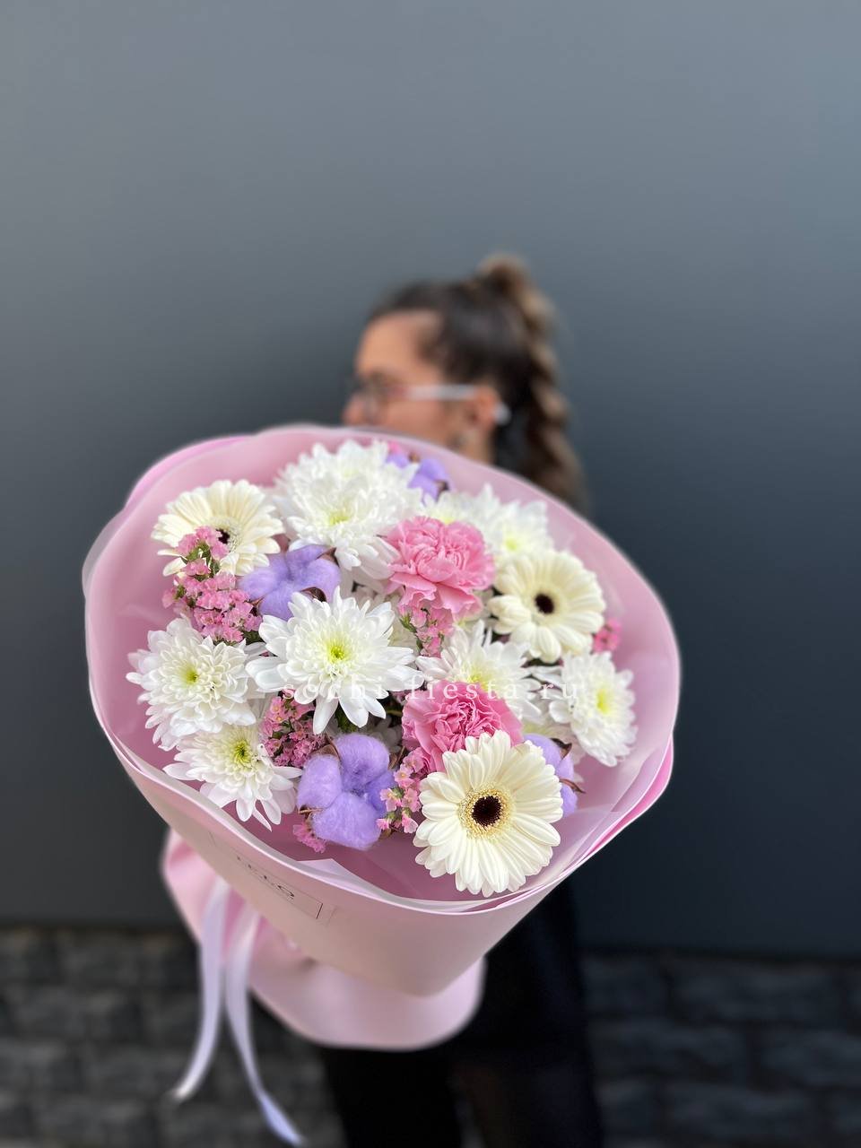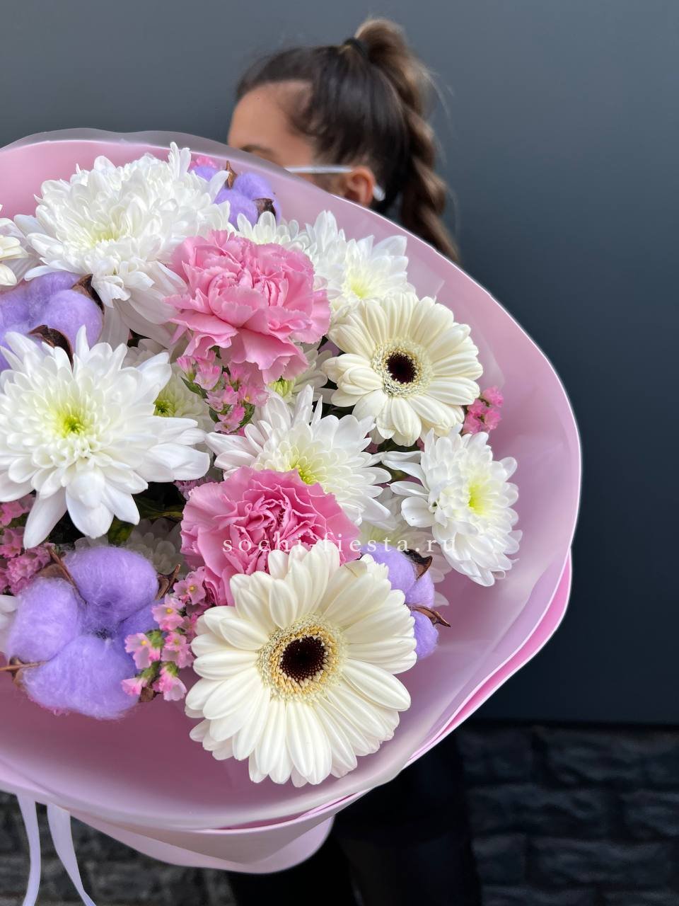 герберы, хризантемы, статица (аналог), диантусы, хлопок, упаковка.