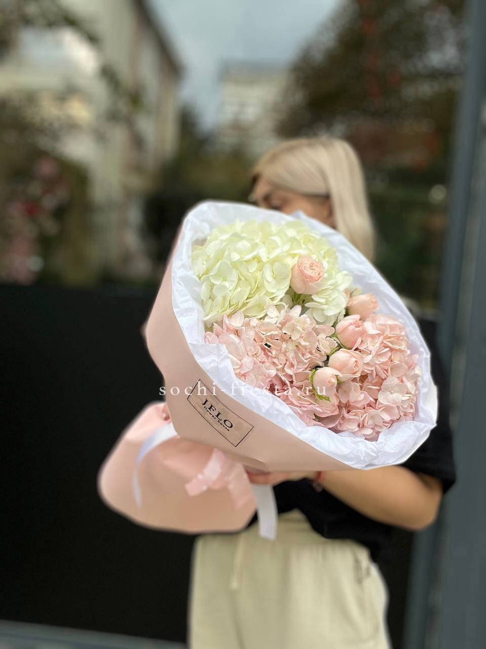 гортензия, французские (вывернутые) розы, лента, дизайнерская пленка, тишью.