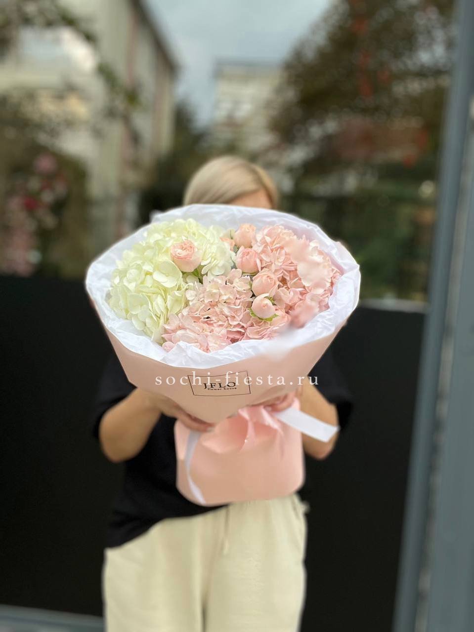 Гортензия в компании французских роз с вывернутыми лепестками образует мягкий объём. Бутоны раскрыты неравномерно, что придаёт букету живописную фактуру и естественность.