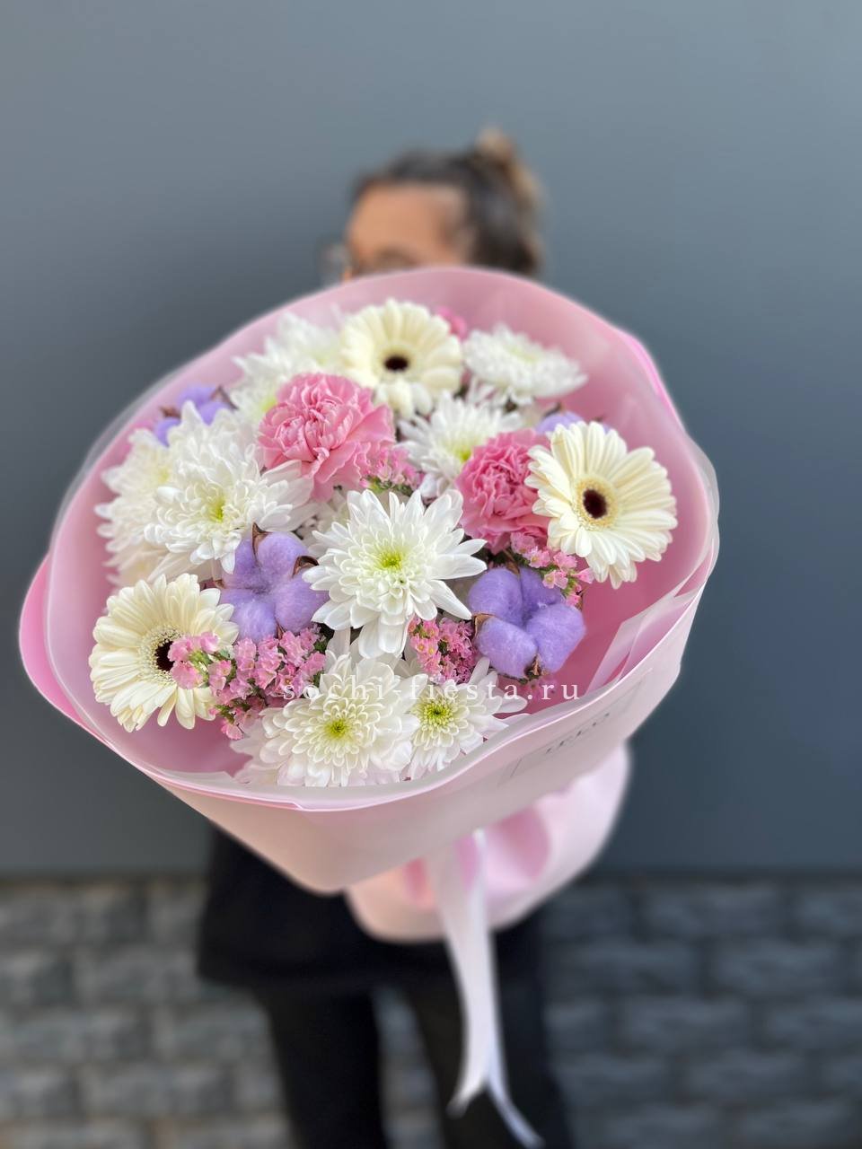 Монохромная палитра с многослойной структурой. Французские розы и эустомы чередуются с кустовыми бутонами, гортензии заполняют объём, а диантусы создают точечные акценты. Букет выглядит цельно и графично.
