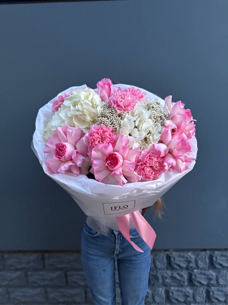 Пионовидные розы и гортензия образуют плотное ядро композиции, а диантус с эустомой разворачиваются по краям. Эвкалипт задает движение и глубину всей формы.