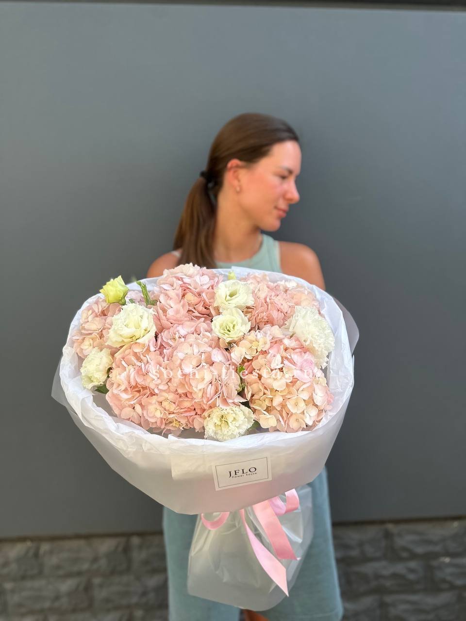 Воздушная композиция с белоснежной гортензией и пионовидными розами в окружении эвкалипта и пампасной травы. Светлая палитра и природная текстура создают ощущение летнего сада. Гармония форм и естественная свежесть в каждом элементе.