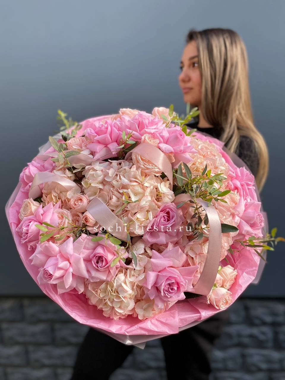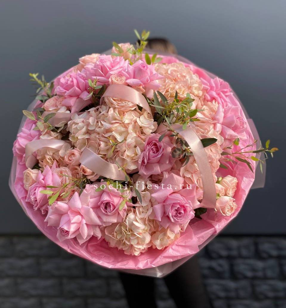 гортензия, пионовидные розы, эвкалипт, пампасная трава, лента, дизайнерская упаковка.