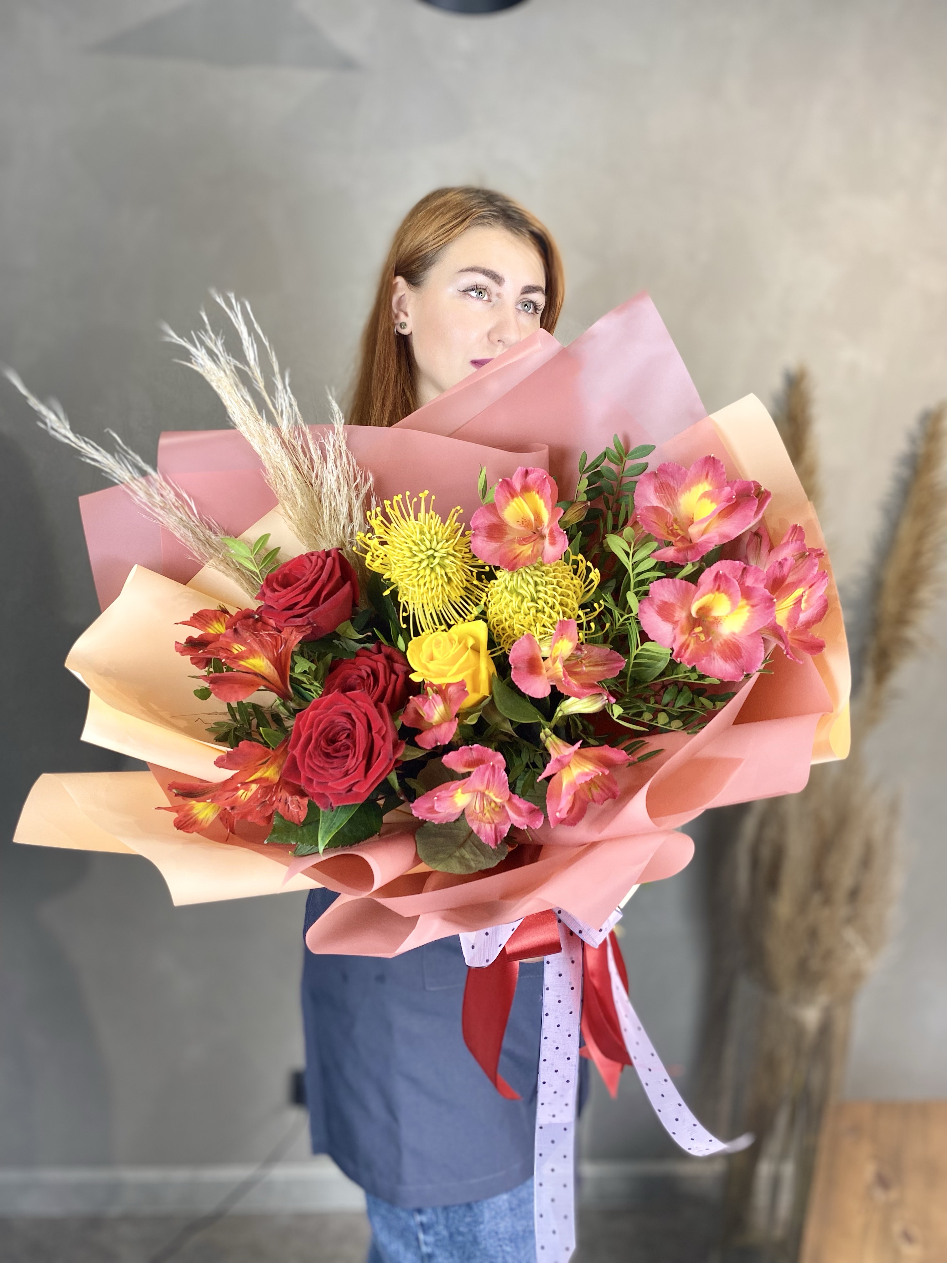розы одноголовые, альстромерия, нутан, писташ, сухоцвет, лента, дизайнерская упаковка.