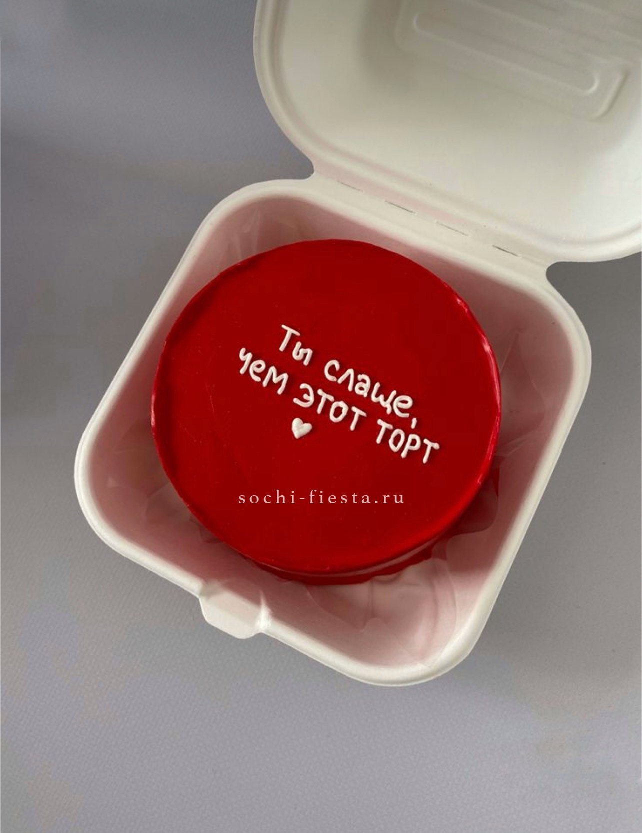 Яркий бенто-торт с дерзкой надписью и продуманным оформлением. Два варианта начинки делают его универсальным для разных вкусов. Отличный способ добавить юмора в праздничный день.